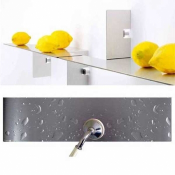 easyshelf, das drei Millimeter Faltregal für Bad, Küche, Büro ..... Die Oberfläche besteht aus gebürstetem Aluminium. Das Material bestimmt zusammen mit der linienartig umlaufenden Stirn aus schwarzem Kunststoff das Erscheinungsbild des Regals. Durch die Materialstärke von nur drei Millimetern und der durch das Falten bestimmten Form erscheint das Regal je nach Blickwinkel als einfache Linie oder gefaltete Skulptur. Das easyshelf funktioniert überall, wo Sie ein Regal brauchen, ob als CD-Ablage für 31 CDs oder für Taschenbücher. Das Aluminium ist vor Oxidation geschützt. Es läuft nicht an und verfärbt sich nicht. Sie entscheiden, ob die gefalteten Flügel nach oben oder unten zeigen .... zeigen die Flügel nach oben, können sie als CD- oder Buchstütze dienen.